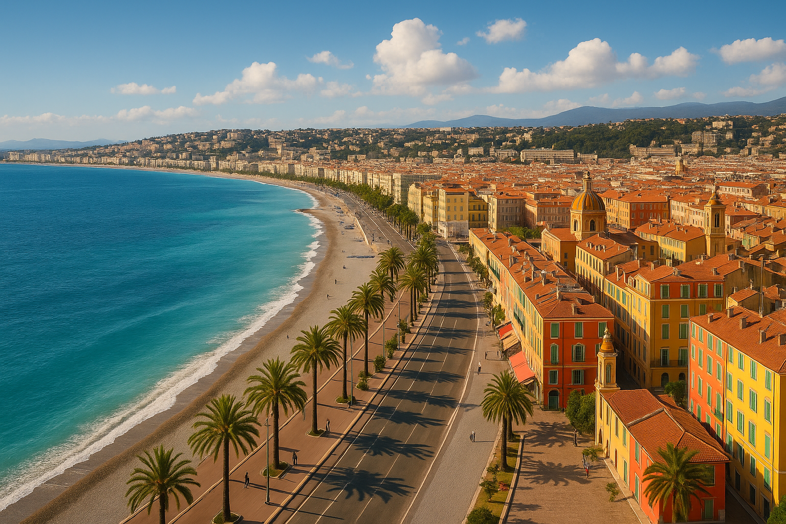 [Nice, France beach scene with pebbled shore, turquoise Mediterranean waters, and vibrant city backdrop – AI Generated Image]